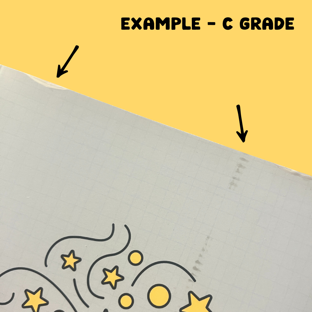 C grade journals have marks or imperfections on them which are more noticeable (such as roller marks or peeling to the edge of the cover's laminate), hence the larger discount.
